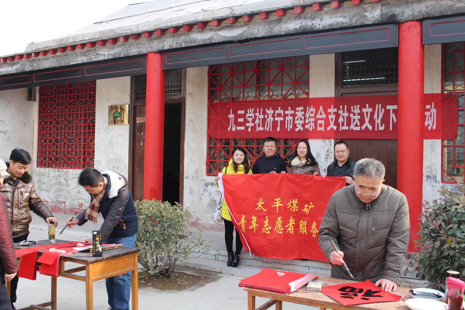 2月14日(正月二十六),太平煤矿团委组织矿青年志愿者联合九三学社济宁市委综合支社、济宁市政协书画联谊会、邹鲁画院的书法家们一起来到邹城市太平镇秦河村为村民义务写春联,送出新春的祝福。